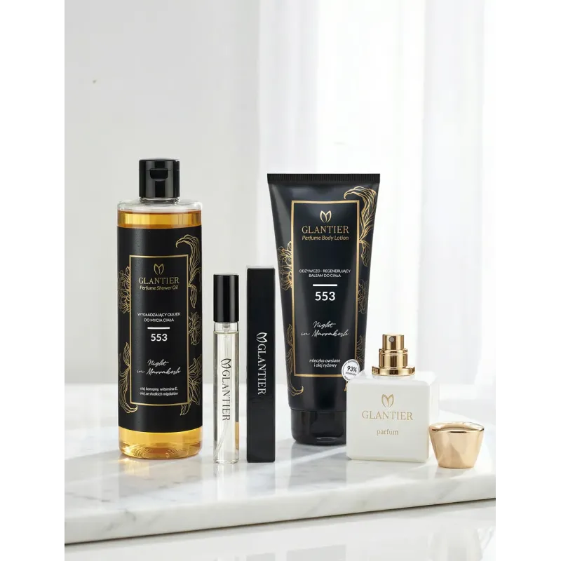 A Glantier 553 női szett elegáns kompozíció azoknak a nőknek, akik értékelik a karakteres illatokat és az érzéki bőrápolást. Ez a keleties-virágos illatcsalád kávé, mandula és tubarózsa jegyeivel mély, nőies aromába burkolja a bőrt. A szett tartalmaz egy 50 ml-es üveg Glantier Premium parfümöt, egy 15 ml-es üvegcsét, egy testápolót és egy tusfürdőt – mindezt ugyanabból az illatcsaládból. Piros ajándékdobozban érkezik, így tökéletes ajándék egy olyan nőnek, aki értékeli az intenzív illatokat és az állandó bőrápolást.